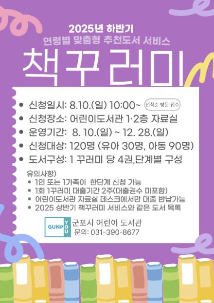하반기 책꾸러미 서비스는 8월부터 12월까지 진행되며, 선착순 방문 접수 방식으로 운영된다. 신청을 원하는 이용자는 군포시 어린이도서관 1층 또는 2층 자료실에 대출증을 지참하여 방문하면 된다.