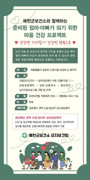 참여 희망자는 예천군보건소 모자보건팀을 방문하거나 전화 또는 홍보포스터의 QR코드를 통해 익명으로 쉽게 참여할 수 있고 연중 내내 신청 가능하다.