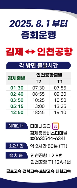 인천공항 고속버스 증편 노선은 김제종합버스터미널에서 오전 1시 30분 첫차를 시작으로 오후 12시 50분까지 하루 5회 운행하며, 약 2시간 50분 소요된다.