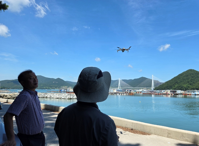 ![]() 남면 가두리 양식장 밀집 해역에서 드론을 활용한 적조 예찰 활동을 하고 있다. |