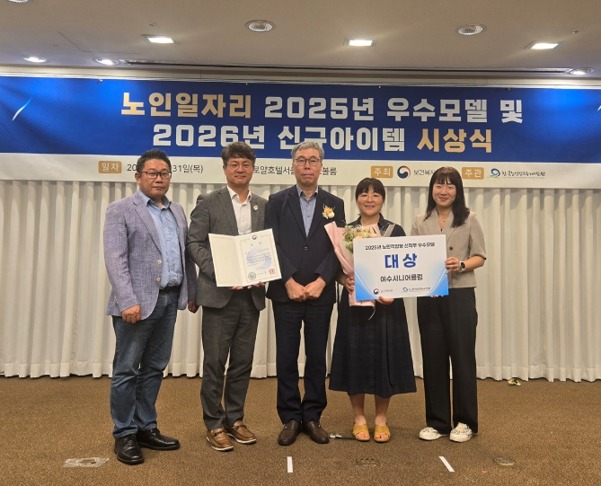![]() 한국노인인력개발원 주관 ‘2025년 노인일자리사업 우수모델’ 공모에서 보건복지부장관상 ‘대상’을 수상했으며, 시상식이 지난 31일 로얄호텔서울에서 개최됐다. |