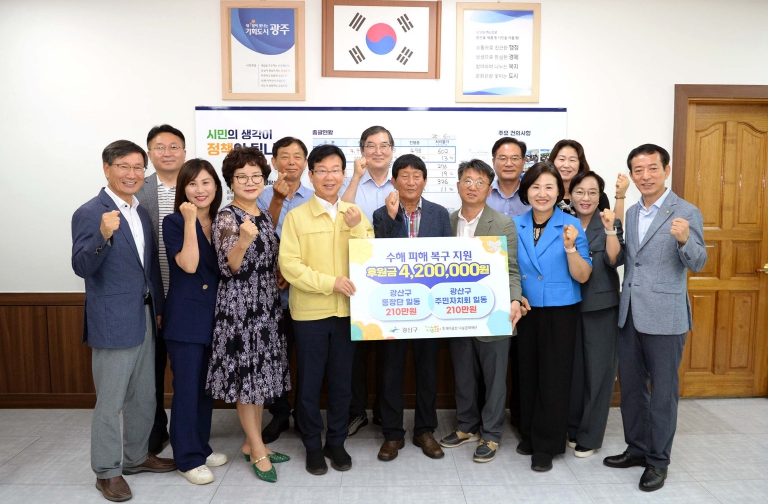 성금은 광산구 21개 동에서 활동하는 통장과 주민자치 위원들이 수해 피해 주민들에게 도움이 되길 바라는 마음을 담았다. 전달된 성금은 수해 피해 가구를 도울 예정이다.