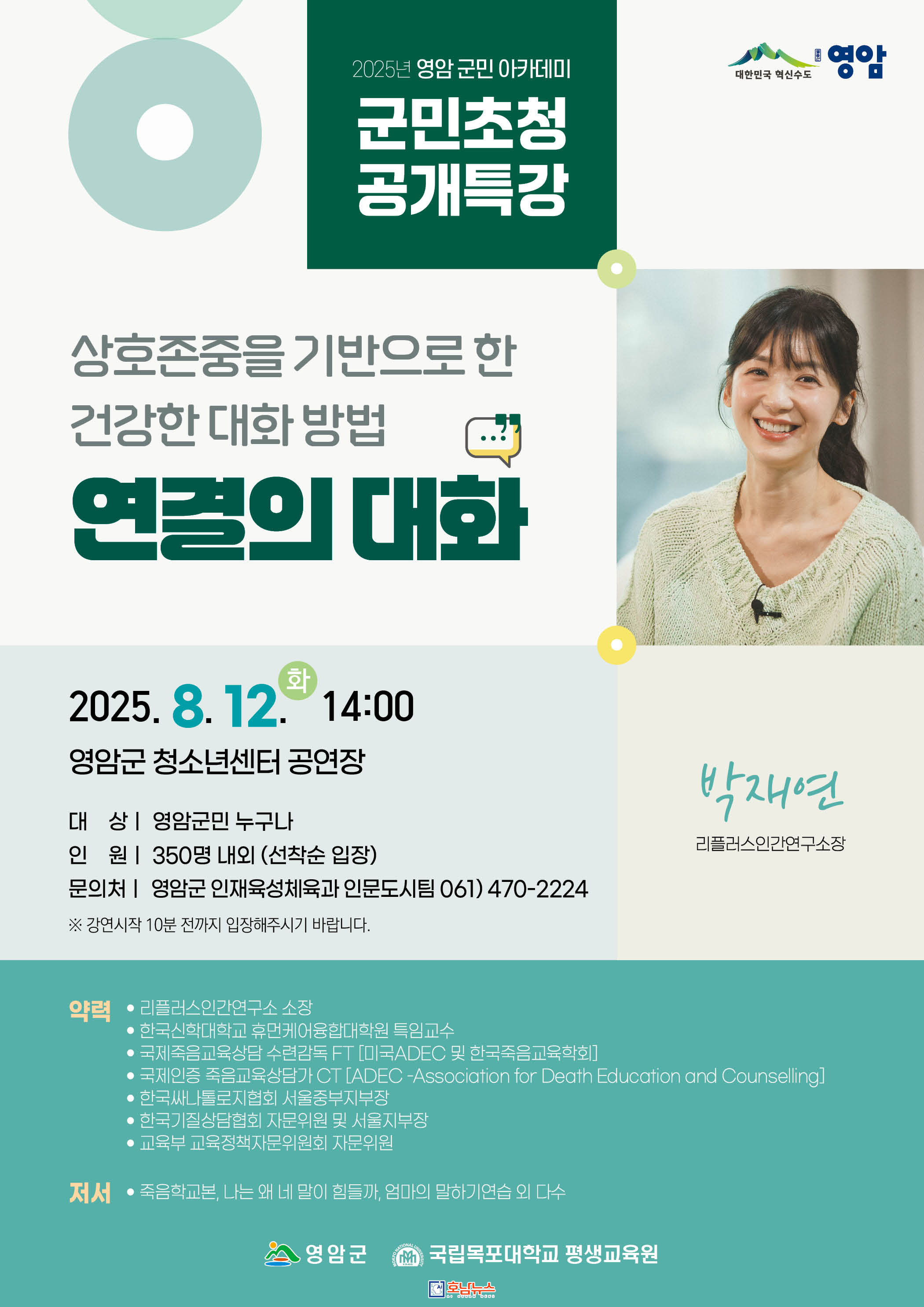 노재영 영암군 인재육성체육과장은 “가족과 이웃, 직장 내 소통에 어려움을 겪고 있는 이들에게 도움을 주는 특강이다. 더 나은 소통을 생각하는 자리에 많은 영암군민의 관심과 참여 바란다”고 전했다.
