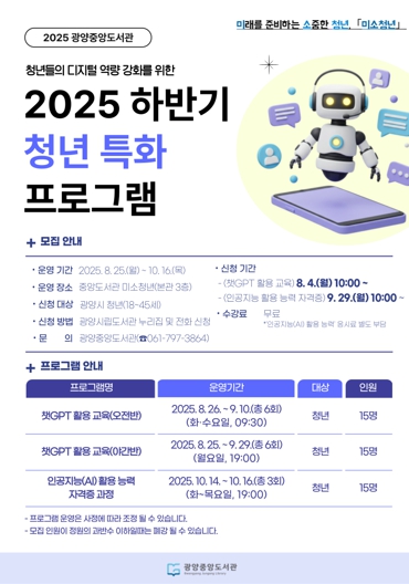 남수향 도서관과 중앙도서관팀장은 “청년들이 인공지능 시대에 발맞춘 실질적인 역량을 갖출 수 있도록 다양한 교육 기회를 지속적으로 제공하겠다”고 밝혔다.