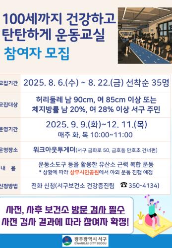 서구는 지역 주민들의 건강한 생활습관 형성과 만성질환 예방을 위한 프로그램 ‘100세까지 건강하고 탄탄하게 운동교실’의 참여자를 모집한다.