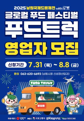 최경식 남원시장은 “이번 2025 남원국제드론제전은 기술과 문화가 융합된 축제로, 푸드트럭 운영을 통해 지역경제 활성화와 글로벌 음식문화 교류의 장이 될 것으로 기대한다”라며 “창의적이고 열정적인 푸드트럭 운영자들의 많은 참여를 바란다”라고 밝혔다.