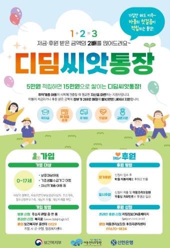 특히, 올해부터는 디딤씨앗통장 가입 대상이 기존 보호대상아동(아동복지시설 보호아동, 가정위탁 보호아동 등) 및 기초생활수급가구 아동에서, 차상위계층 아동까지로 확대됐다.