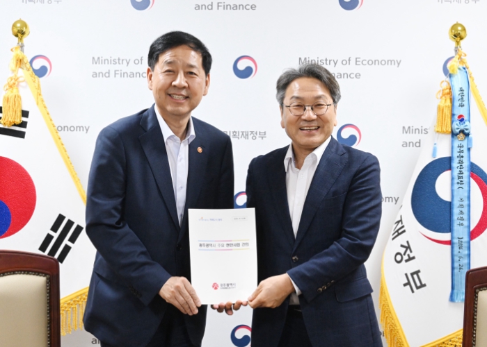 ![]() 강기정 광주광역시장이 5일 정부서울청사에서 구윤철 경제부총리 겸 기획재정부 장관에게 내년도 광주시 주요 현안사업을 건의한 뒤 기념촬영을 하고 있다. /광주광역시 제공 |