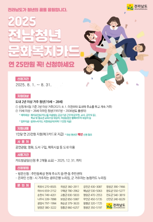 윤연화 전남도 인구청년이민국장은 “전남청년 문화복지카드 사업이 청년의 문화·여가 활동을 활성화하고 지역 문화산업에도 긍정적 영향을 주고 있다”며 “지역 청년의 문화 활동 격차 해소를 위해 많은 신청 바란다”고 말했다.