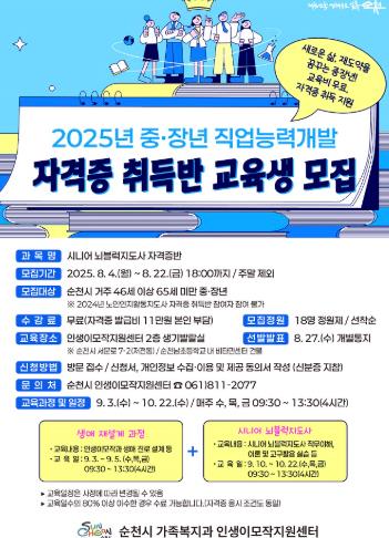 접수 기간은 오는 22일까지이며, 모집대상은 순천시 거주 46세 이상 65세 미만 중·장년으로 선착순 18명을 모집한다.