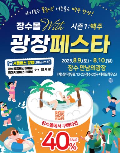 이번 광장페스타는 여름철 온 가족이 함께 즐기며 물놀이·체험·먹거리·농특산물이 어우러진 야외형 테마 축제로 시원한 장수 생맥주와 함께 무더위를 날릴 수 있는 여름 축제이다.