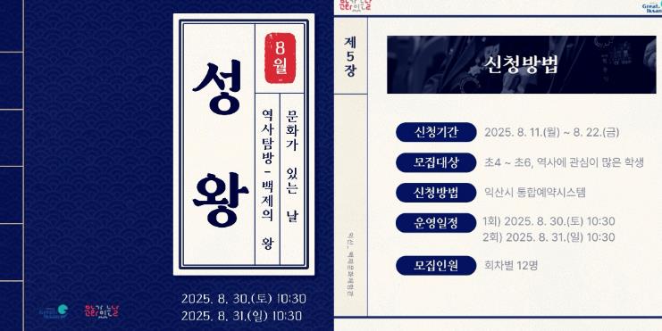 익산시는 오는 30일과 31일, 백제문화체험관에서 8월 문화가 있는 날 프로그램으로 '역사탐방-백제의 왕'을 운영한다고 7일 밝혔다.