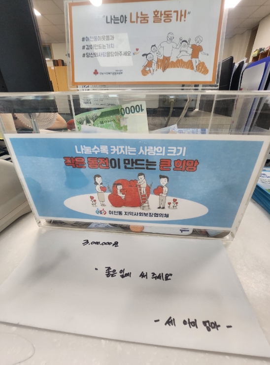 ![]() 여수시 여천동에 거주하는 세 자녀의 엄마 A씨가 어려운 이웃을 위해 써달라며 여천동 지역사회보장협의체에 성금 300만 원을 기탁했다. |