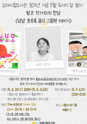 ![]() 김제시립도서관, 9월 독서의 달 행사 '밤코 작가와의 만남 진행' |