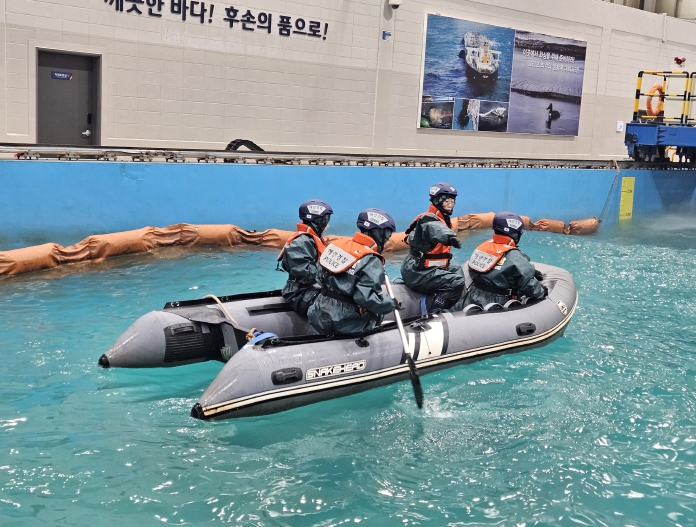 ![]() 교원들이 직접 오염방제 보트에 탑승해 실습하는 장면 |