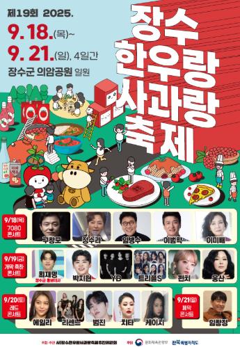한편 장수군 대표축제 ‘제19회 장수 한우랑 사과랑 축제’는 지난해 제18회 축제 때 약 30만 명이 온·오프라인으로 참여하며 전북 최대 규모의 축제로서 명성을 입증했고 3년 연속 전북특별자치도 최우수축제 선정되는 등 장수군의 브랜드 가치를 높이고 지역경제 활성화에 크게 기여하고 있다.