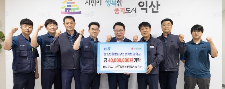 익산시는 HL만도㈜와 만도노동조합 익산지부가 시청을 방문해 청소년희망나무프로젝트 장학금 4,000만 원을 기탁했다고 13일 밝혔다.