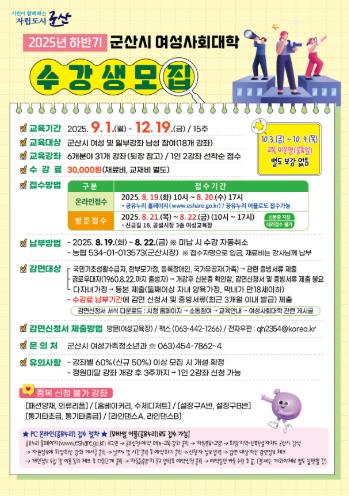 ![]() 군산시, 2025년 하반기 여성사회대학 프로그램 수강생 모집 |