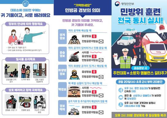 이번 훈련은 ▲적 공습 대비 민방위 대피훈련 ▲긴급차량(소방차․앰뷸런스) 길 터주기 훈련을 포함해 진행된다.