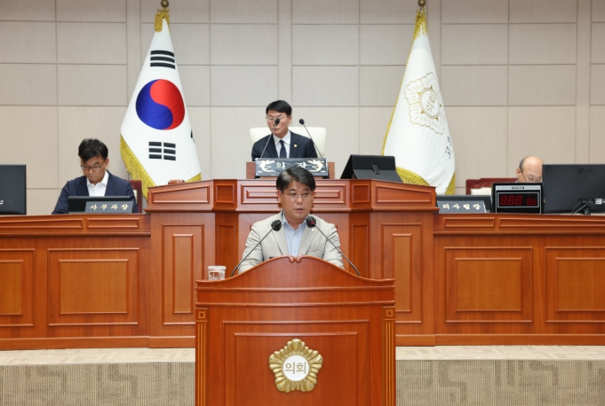 ![]() 8월 13일 제339회 임시회 제2차 본회의에서 고건 의원이 해창만간척지 조사특별위원회 연장의 건 제안 설명을 하고 있다. |