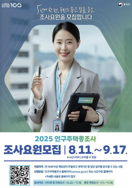 신청기간은 조사관리요원은 8월 22일까지, 조사원은 9월 17일까지이며, 지원서 접수는 인구주택총조사 홈페이지와 김제시청 정보통신과 방문을 통해 접수할 수 있다.