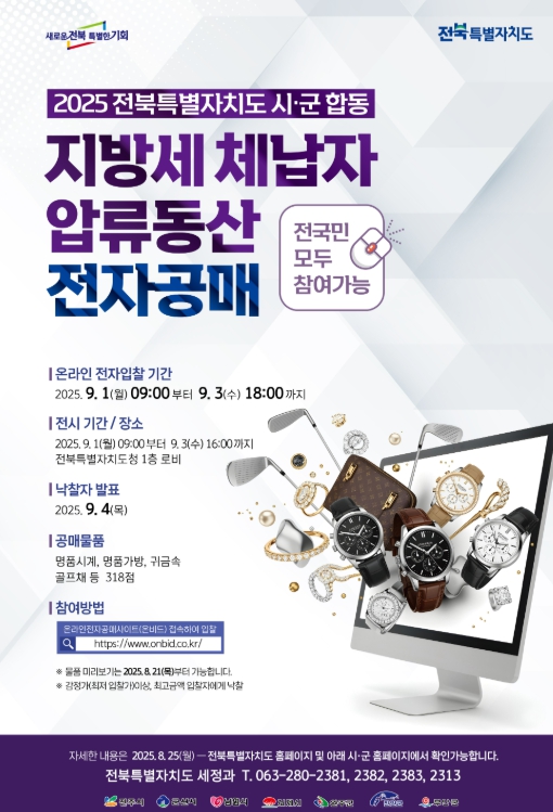 공매 대상 물품은 모두 지방세 체납액 징수를 위해 압류한 것으로, 전북자치도와 부안군은 이번 매각을 위탁수수료 없이 직접 진행해 행정비용 절감과 세수 확보를 동시에 기대하고 있다.