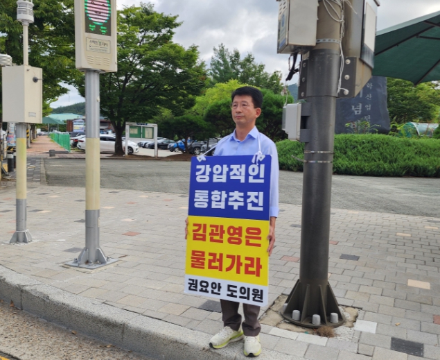 권 의원은 지난달 14일부터 완주군 삼봉지구와 봉동읍 일원에서 주민 통행이 많은 출근 시간대(오전 7시 30분 ~ 8시 30분)에 1인 시위를 진행하고 있으며, 통합이 중단될 때까지 계속하겠다는 입장이다.