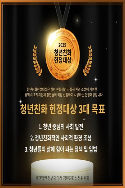 ‘청년친화헌정대상’은 국회사무처 소관 사단법인 ‘청년과 미래’가 주관하며, 청년친화적 환경조성에 기여한 기관의 공로를 인정하는 상이다. 평가는 정책, 입법, 지원, 소통 분야의 청년 친화도를 평가하는 ‘청년친화지수’를 종합해 이뤄진다.