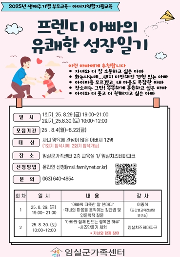 아버지 교육 1회기는 29일 저녁 7시 임실군가족센터 교육실에서 진행되며, 이종희 공간별교육컨설팅연구소장을 초청해‘자녀의 마음을 움직이는 칭찬법 및 인문학적 질문’을 주제로 강의를 진행한다.