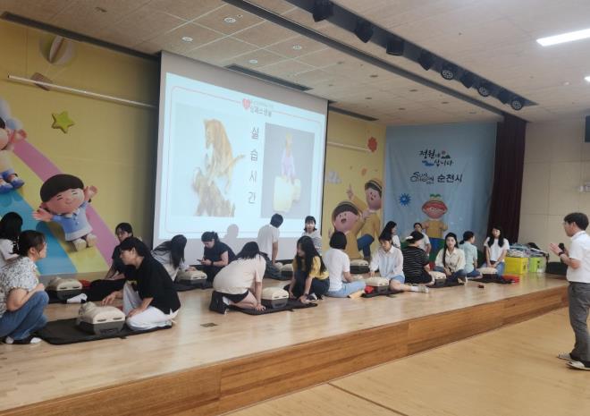 이번 교육은 순천시육아종합지원센터가 성가롤로권역응급의료센터 전문강사를 초청하여 현장 경험을 바탕으로 진행됐으며, 소아 및 성인을 위한 심폐소생술과 자동심장충격기 사용법, 기도 폐쇄 응급처치술 등 이론과 실습을 체계적으로 다루었다.