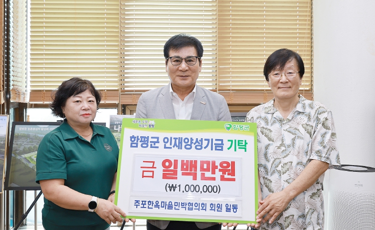 함평군은 18일 “▲주포한옥마을민박협의회(회장 성봉제)과 ▲삼광필름(대표 이봉근)이 이날 인재양성기금에 각각 100만 원씩 기탁했다”고 밝혔다.