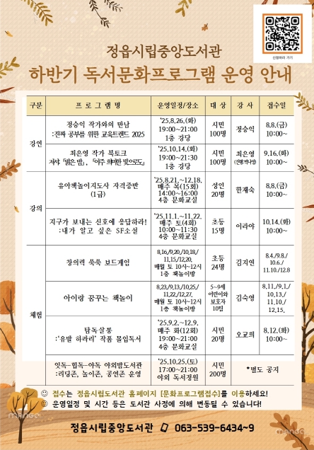 ![]() 정읍시립중앙도서관, 하반기 독서문화프로그램 개막 |