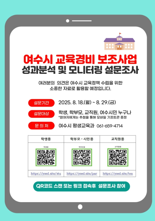 이번 설문은 여수시 교육경비 보조사업 전반을 대상으로 ▲시민 인식도 ▲사업별 만족도 및 필요성 ▲개선 의견 등을 수렴한다.