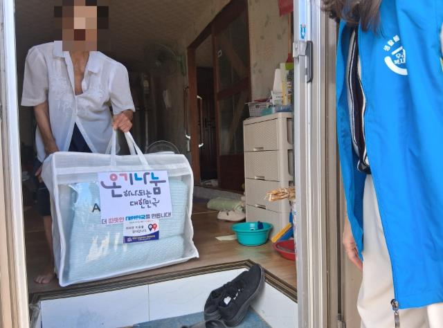 ![]() 취약계층 세대에 여름이불을 전달하고 있는 모습 |
