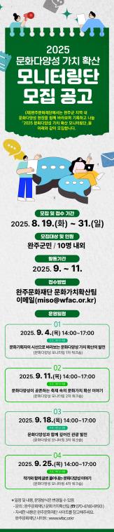 선정된 모니터링단에게는 소정의 활동비가 지급되며, △문화다양성의 이해 및 모니터링 활동을 위한 워크숍 △완주군 내 축제·공간·문화콘텐츠에 대한 모니터링 △활동 성과를 공유하는 결과 공유회 등 다양한 프로그램에 참여하게 된다.