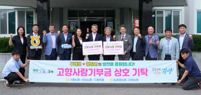 이번 상호 기부는 광양시의 동광양농협과 다압농협, 구례군의 구례농협, 산동농협, 구례축협이 참여했으며, 각 550만 원씩을 상호 기탁했다.