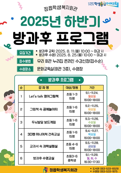 방과후 프로그램은 현재 정읍학생복지회관 누리집을 통해 신청접수 받고 있으며, 수영은 오는 25일 10시부터 신청 가능하다.