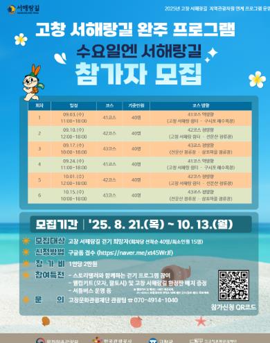 ‘수요일엔 서해랑길’은 고창 서해랑길의 대표 코스를 매주 한 구간씩 완주하는 정기 프로그램으로, 회차별 선착순 40명을 모집해 9월 3일부터 10월 15일까지 총 6회에 걸쳐 진행된다.