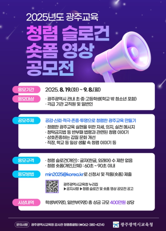 ![]() 광주광역시교육청, 청렴 슬로건·숏폼 공모 |