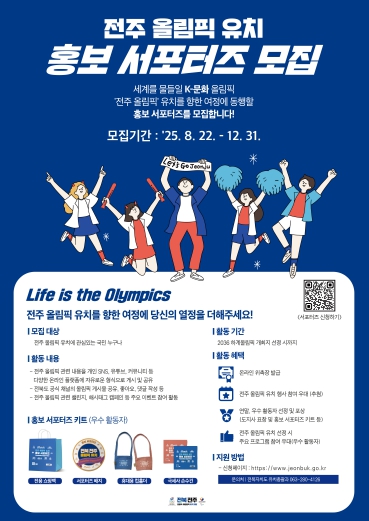 모집 기간은 오는 8월 22일부터 12월 31일까지이며, 전주 올림픽 유치에 관심 있는 국민 누구나 신청할 수 있다. 신청은 전북특별자치도 누리집에서 본인 인증 후 가능하다.