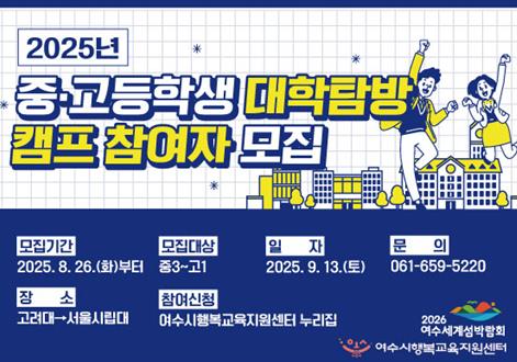 이번 캠프는 여수시행복교육지원센터가 주관하는 진로체험 프로그램의 하나로 9월 13일 고려대학교 서울캠퍼스와 서울시립대학교를 탐방한다.
