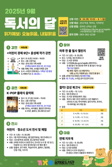 9월에는 △'어린이 경제 9단' 윤성애 작가 강연 △K-POP 클래식 음악회 △어린이·청소년 도서 전시 및 체험 △하루 한 줄 필사 챌린지, △찰칵! 감성 북크닉△연체 지우개 등 6개 프로그램이 마련된다.
