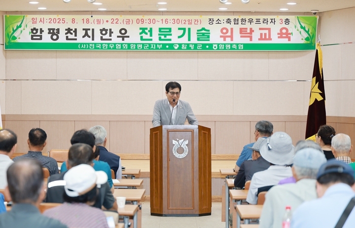 함평군은 24일 “한우 사양관리 전문기술 교육이 지난 18일과 22일 두 차례에 걸쳐 함평축협 대회의실에서 (사)전국한우협회 함평군지부 회원 120명을 대상으로 실시됐다”고 밝혔다.