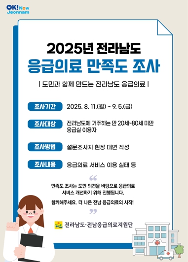 응급의료 만족도 조사 전남도 차원에서 처음 하는 것으로 응급실 이용 실태와 문제점 등에 대한 전반적인 사항을 조사해 2026년 지역응급의료시행계획에 반영, 응급의료 서비스를 높이는데 활용할 예정이다.