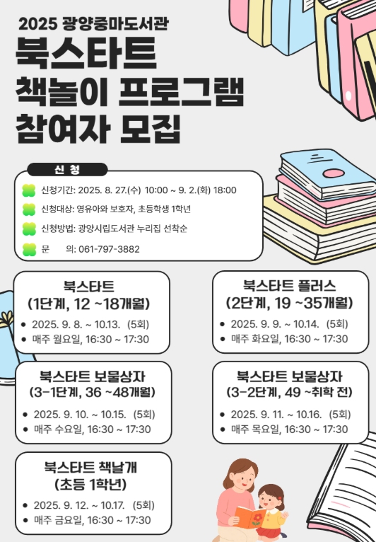 북스타트 책놀이 프로그램 수강 신청 및 기타 문의사항은 광양시립도서관 누리집을 확인하거나 중마도서관으로 문의하면 된다.