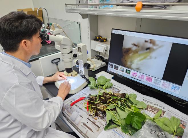 ![]() 실체현미경을 이용해 딸기 꽃눈분화 검경을 하는 모습 |