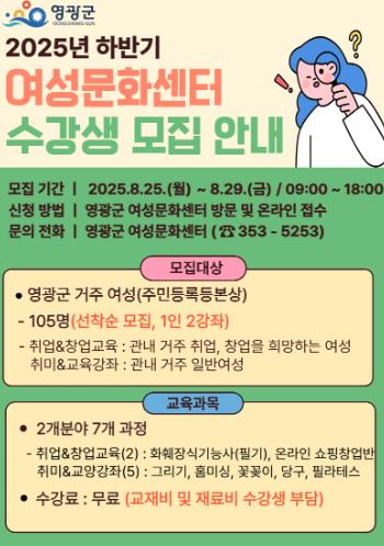 ![]() 영광군 '2025년 하반기 여성문화센터 프로그램'수강생 모집 |