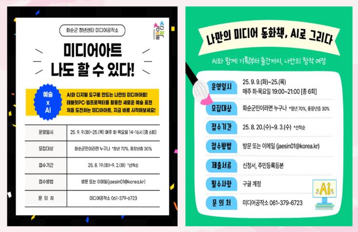 신청을 위해서는 신청서와 함께 주민등록등본을 제출해야 하며 ▲‘미디어아트’ 과정은 9월 2일까지 ▲‘미디어동화책’ 과정은 9월 3일까지 화순군 청년센터 방문 또는 공식 홈페이지를 통해 신청이 가능하다.