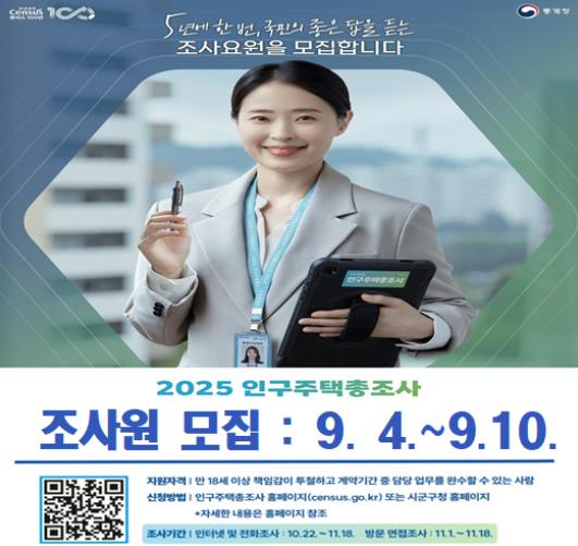 ![]() 광양시, ‘2025 인구주택총조사’ 조사원 모집 |