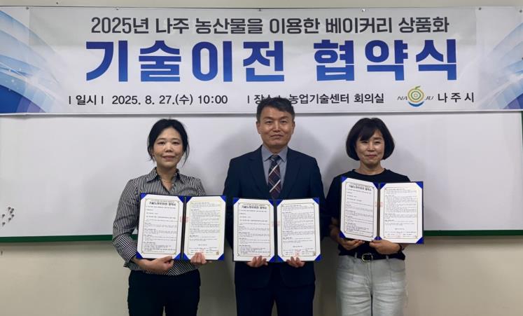 나주시는 지난 27일 농업기술센터 회의실에서 지역 농산물을 활용한 베이커리 상품화 기술이전 협약을 체결했다고 밝혔다.